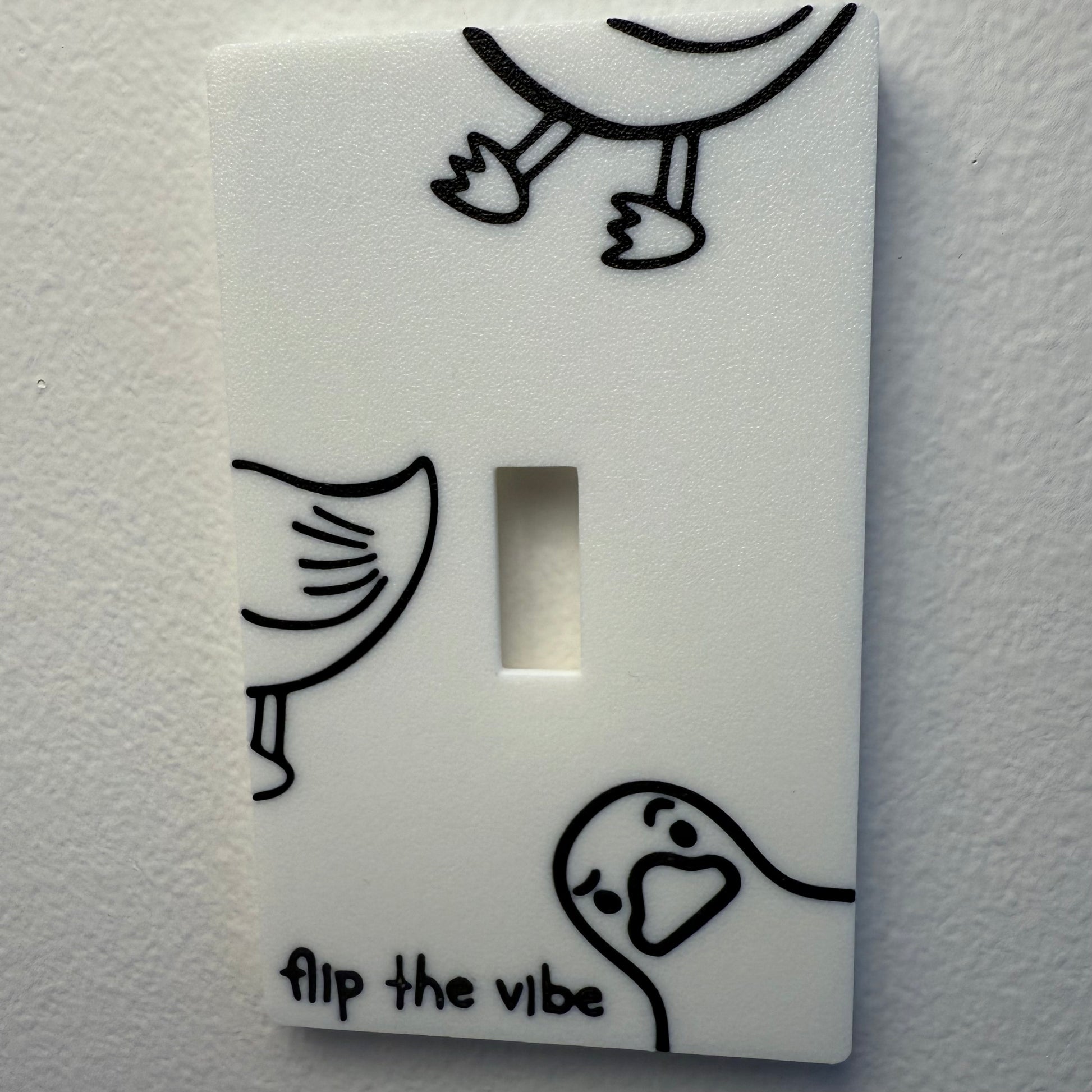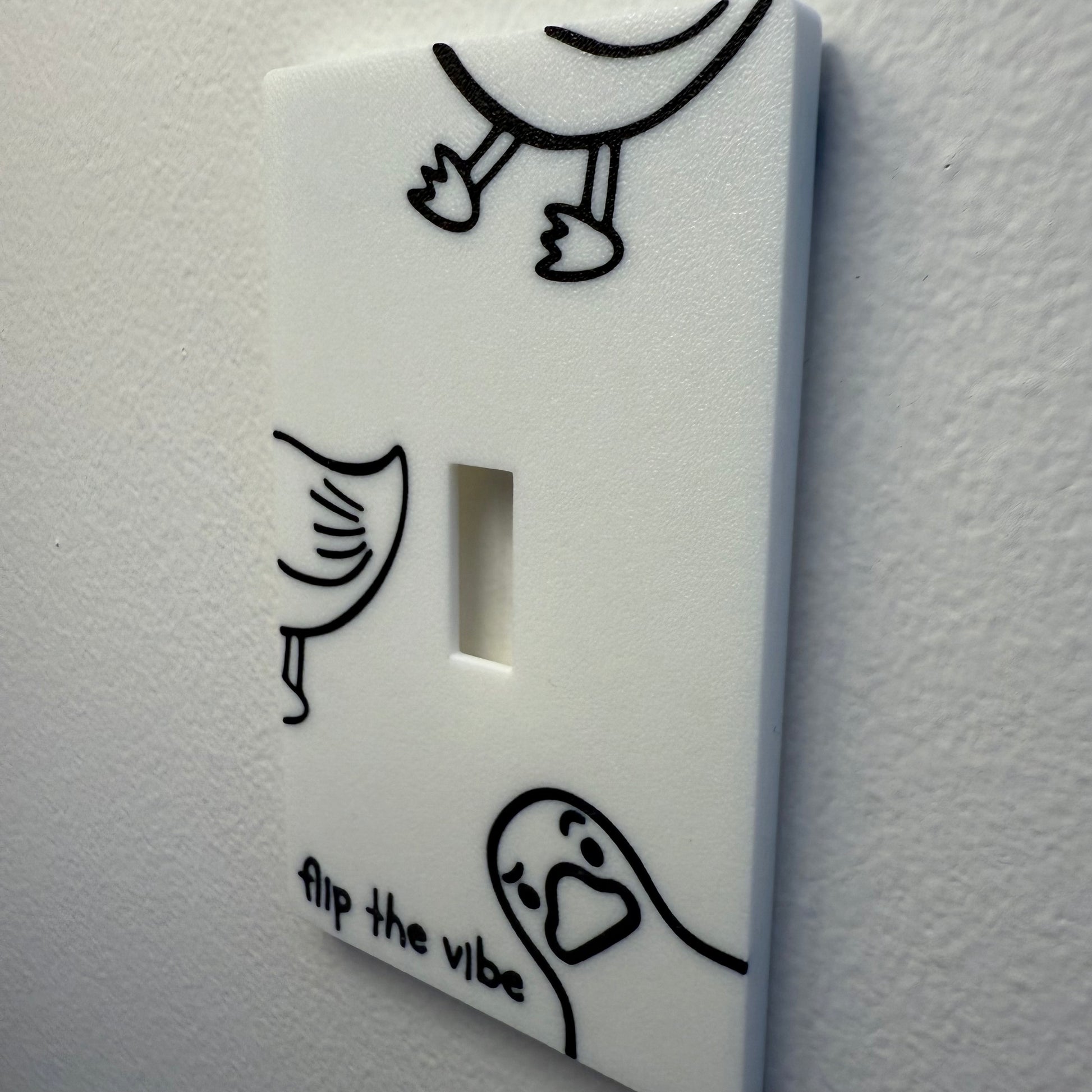 Turn on the fun with flip the vibe, the interchangable light switch cover featuring our quirky mascot, the ornery duck. Flip the switch and flip the vibe - your room will never be the same. (Don't worry, our duck isn't actually ornery. He just likes to quack jokes.)